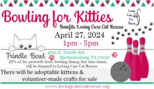 Join us for an afternoon of bowling and fun at Trindle Bowl on April 27th from 1:00 pm to 5:00 pm at 4695 E. Trindle Rd in Mechanicsburg PA. Trindle Bowl has generously agreed to donate 25% of their proceeds from the afternoon. Come to bowl or meet adoptable kitties, or both! Volunteer-made crafts and baked goods will be sold.
